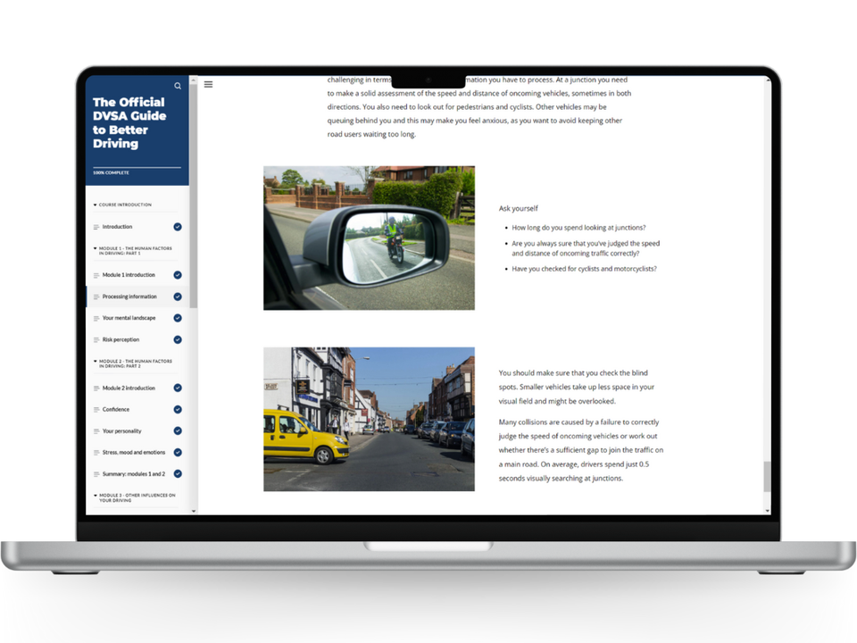 Based on the bestselling book of the same name by Doctor Lisa Dorn, Associate Professor of Driver Behaviour at Cranfield University, The Official DVSA Guide to Better Driving e-learning course will help you to reduce your anxiety, boost your confidence and drive safely.