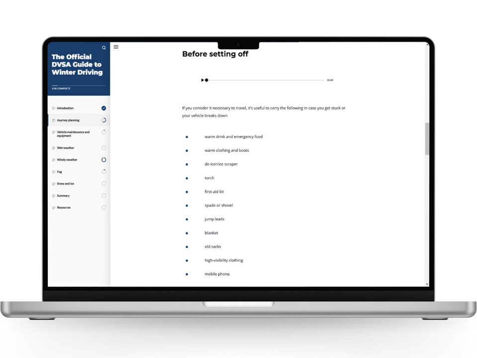 Through scenario-based learning, diagrams and imagery, interactive exercises, and self-reflection tasks The Official DVSA Guide to Winter Driving course will help you to